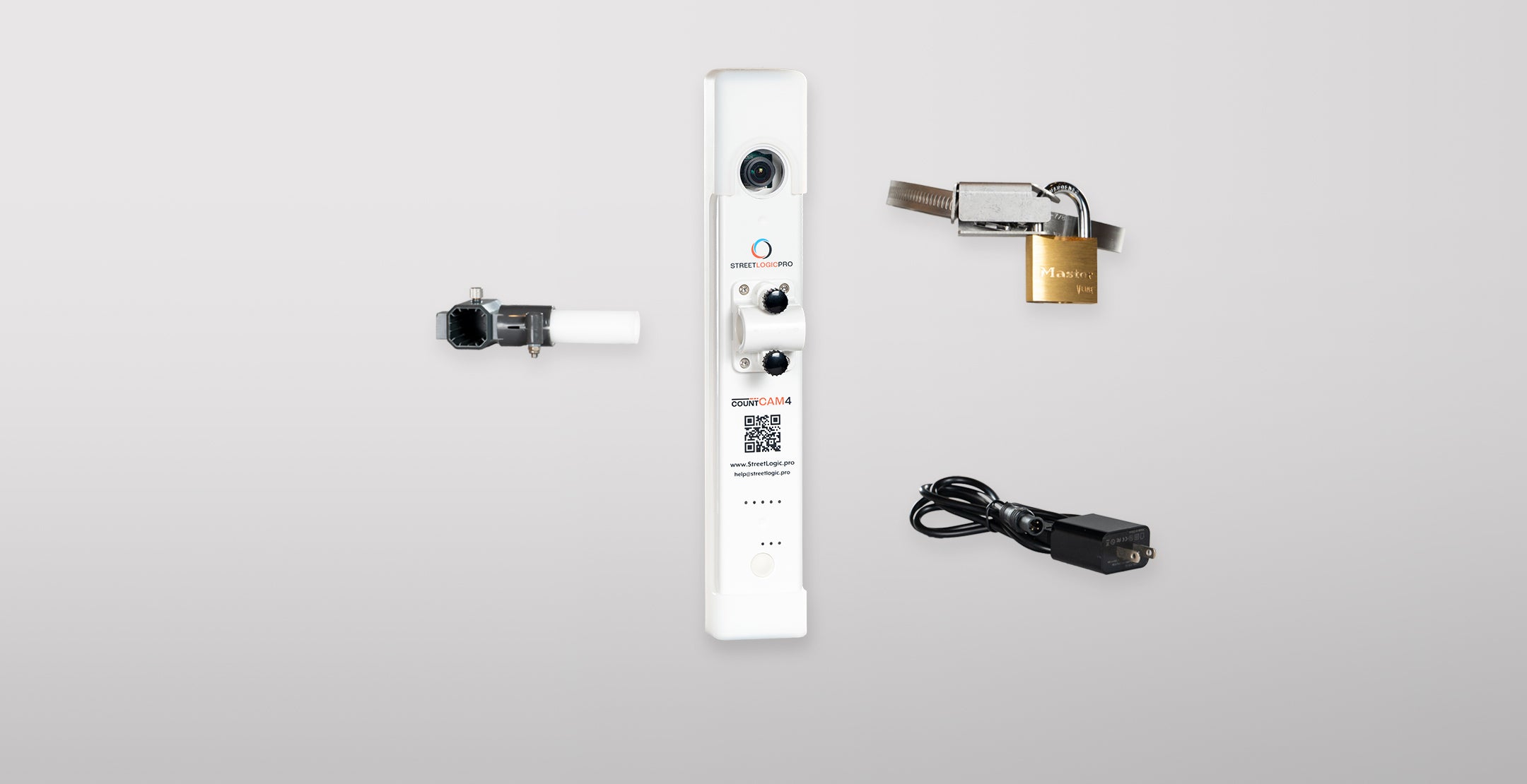 The countCAM4 traffic counting camera comes with everything you need to get started: a download cable, charging cable, mounting bracket, hose clamps (x2), lock bracket, and padlock with key.